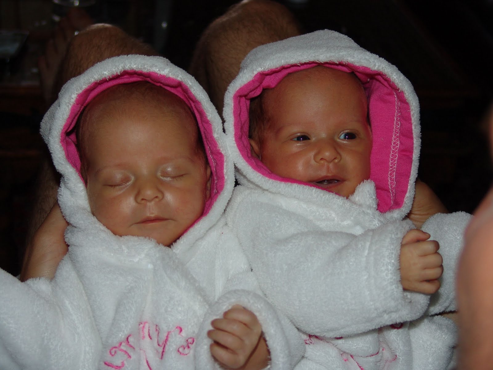 We took them for their injections on Thursday. They did very well, but it was so sad to hear them scream from the pain of the needles in their tiny legs. The Dr. also weighed them and we were both shocked at how much they'd grown in just 2 weeks! Caelyn gained 340g, now weighs 3.33kg (7lbs 5oz) and is 53cm long. Kylie gained 400g so is now only 400g behind Caelyn (vs. 500g), weighs 2.94kg (6lbs 7oz) and is 50cm long.